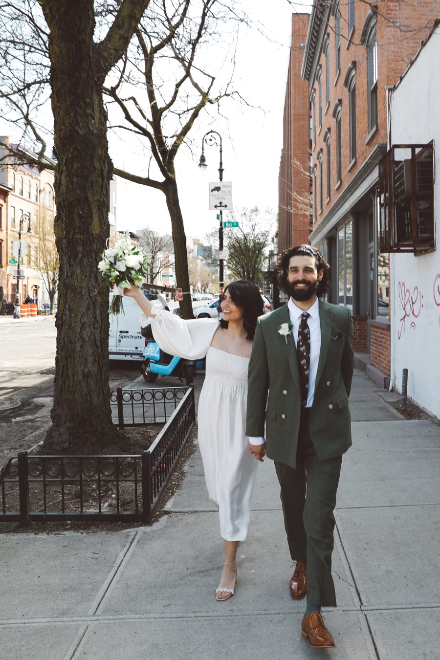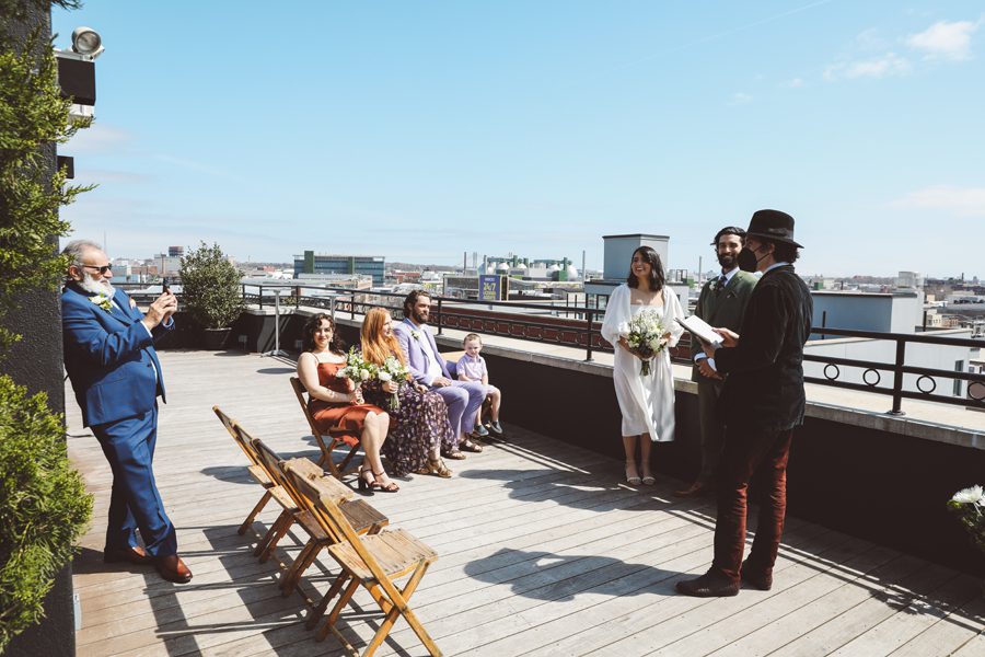 Emma and Daniel were looking for an elopement photographer with a chic, contemporary style and they hired us to photograph and officiate their day. They wanted an intimate elopement celebration and the rooftop of the Box House hotel in Greenpoint, Brooklyn, was a no brainer, just the perfect spot for them. Besides the intimacy and lovely views it was wonderful to shoot around the streets in the area, including some photos by the waterside from where you get gorgeous views of the city.
