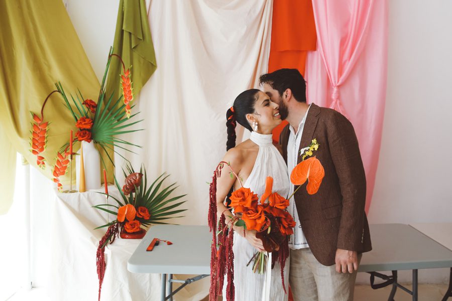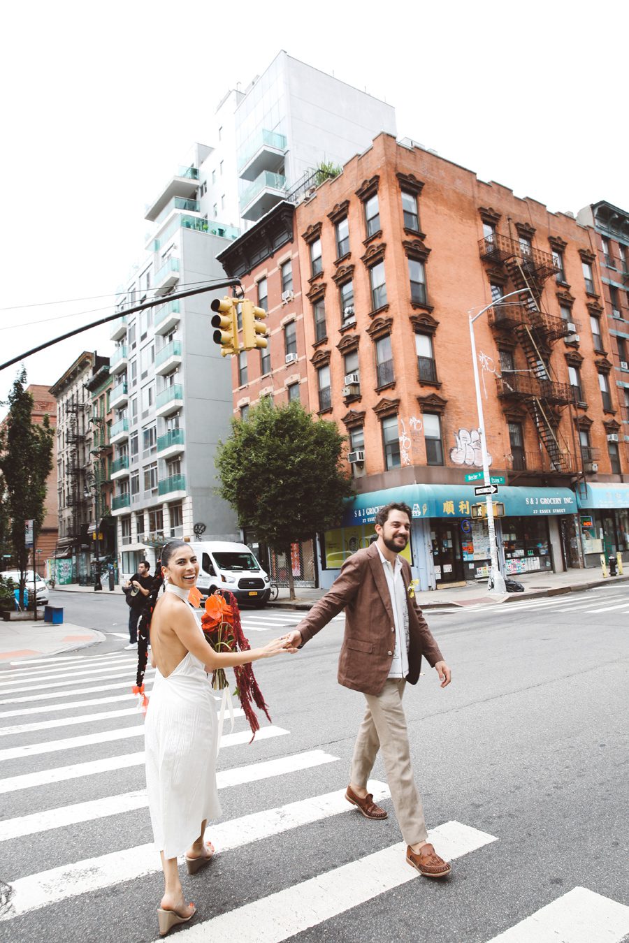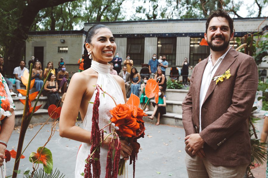 Ana and Evan’s wedding on the Lower East side was everything and more than anyone could have imagined. A multicultural celebration in one of the greatest melting pots of this country, The Lower East Side in Downtown Manhattan. The ceremony took place at a little amphitheater right by the relatively unknown Seward Park Library, in the words of the Bowery Boys, “one of New York’s most beautiful branch libraries”. After meeting the groom while he was waiting by the flower arrangements designed by Andrew Somas and flowers by Fleurotica we were amazed to see the bride, arriving with her dad, in a stunning dress, gorgeous bouquet and incredible hair braid by Rubi Jones from This Is Salon. At the same time, a mariachi band, The Mariachi Habaneros started serenading the bride and adding a really special touch to the event. The ceremony itself was officiated by David as part of our Elopement & Small Wedding Photography Packages. As the words “puede besar a la novia” were pronounced the couple started marching while the mariachi followed and all the procession of guests, led by the couple towards the reception space SOMMWHERE, a wonderful event space right on Ludlow Street. The mariachi kept playing and the DJs started to play while the guests danced and drank delicious signature cocktails on a gorgeous day to remember!